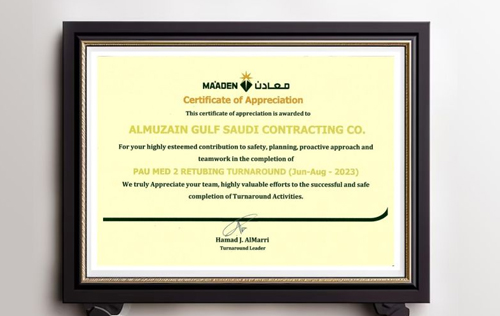 Almuzain is proud to announce the receipt of Certificate of Appreciation from MAADEN in recognition of its outstanding contributions to the successful completion of the PAU MED 2 Retubing Turnaround project (June-August 2023).